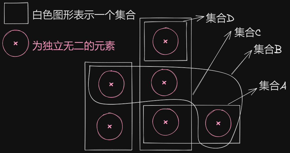 梗概: 化简结果可能不止一种, 但总的元素都是相同的 方法之一: 遍历每一个集合, 发现一个重复集合,就去掉一个,遍历完就化为最简了 1. 图解: 图中A, B, C, D都是重复集合 化简结果之一:先删A,再删D 或者先删D,再删A 化简结果之一:先删B,再删D 或者先删D,再删B 化简结果之一:只删C 2. 原理: base::移除集合的时候, 同一个总集合的其他重复集合有可能变成有效集合,反之不可能 指向原始笔记的链接
