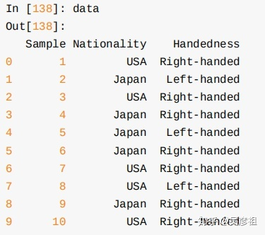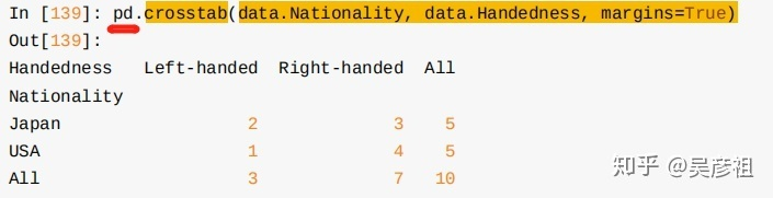 梗概: 类似分布律 对于多个数据记录,按若干个字段来统计频率 指定的若干个字段都相同,就算是同一种数据记录,频率+1 实例: 原始数据: 同时按Nationality和Handedness两个维度统计数据频率:
