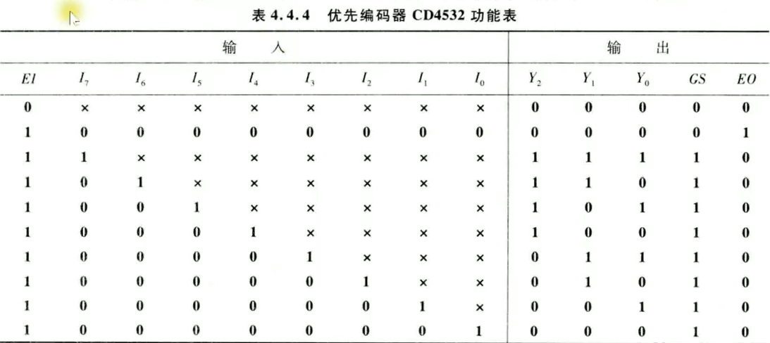功能表 EI可以看作一个开关, 为0时编码器不工作, 为1时编码器才工作 GS主要用于区分不工作与工作时的000输出 EI与EO一起用来提供级联功能 1. 视频讲解 数电_第三讲_第4课时_哔哩哔哩_bilibili