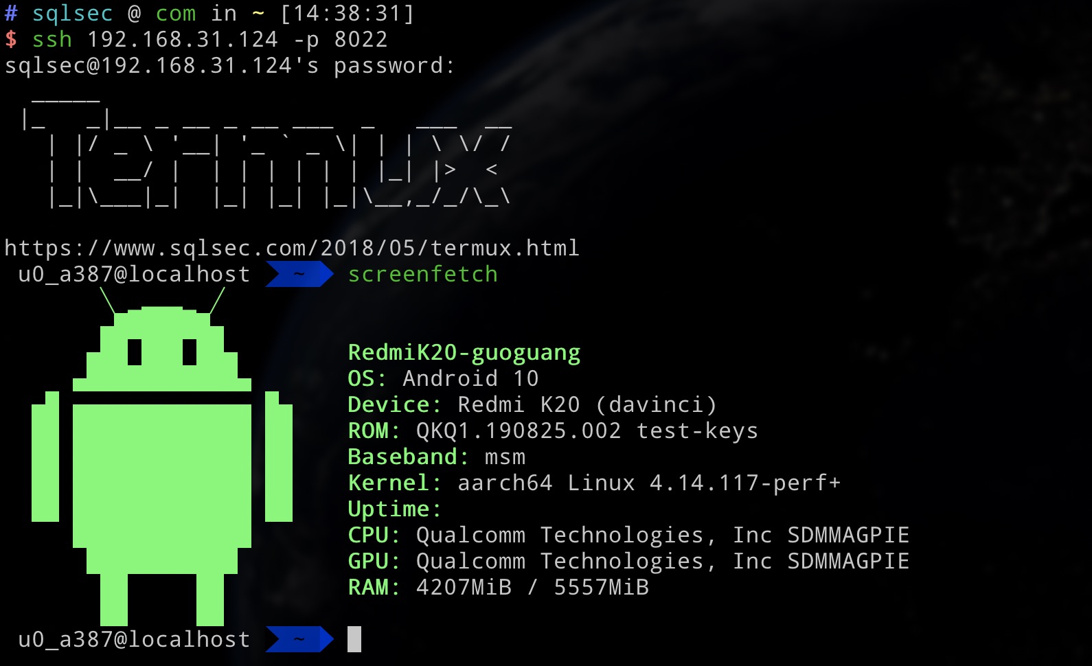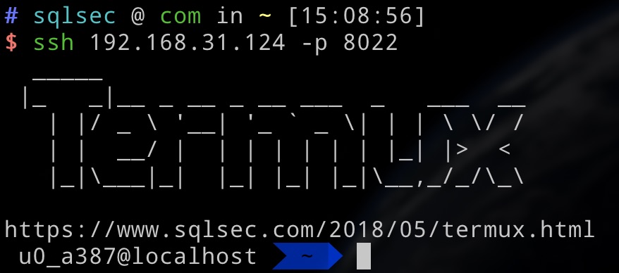 这个使用场景比较少,但是既然要打造中国的 Termux 文档的效果,还是一起写上去吧 首先确保你已经安装了 openssh 软件包,没有安装的话参考上一个小结进行安装,实现这个效果有两大种方法: