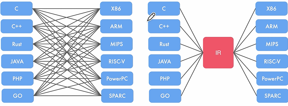 梗概 一种编译架构,主要特点是不同编程语言都有统一的中间代码(LLVM IR),然后再具体优化到对应的操作系统和硬件上 图解 原文 https://zhuanlan.zhihu.com/p/161626997