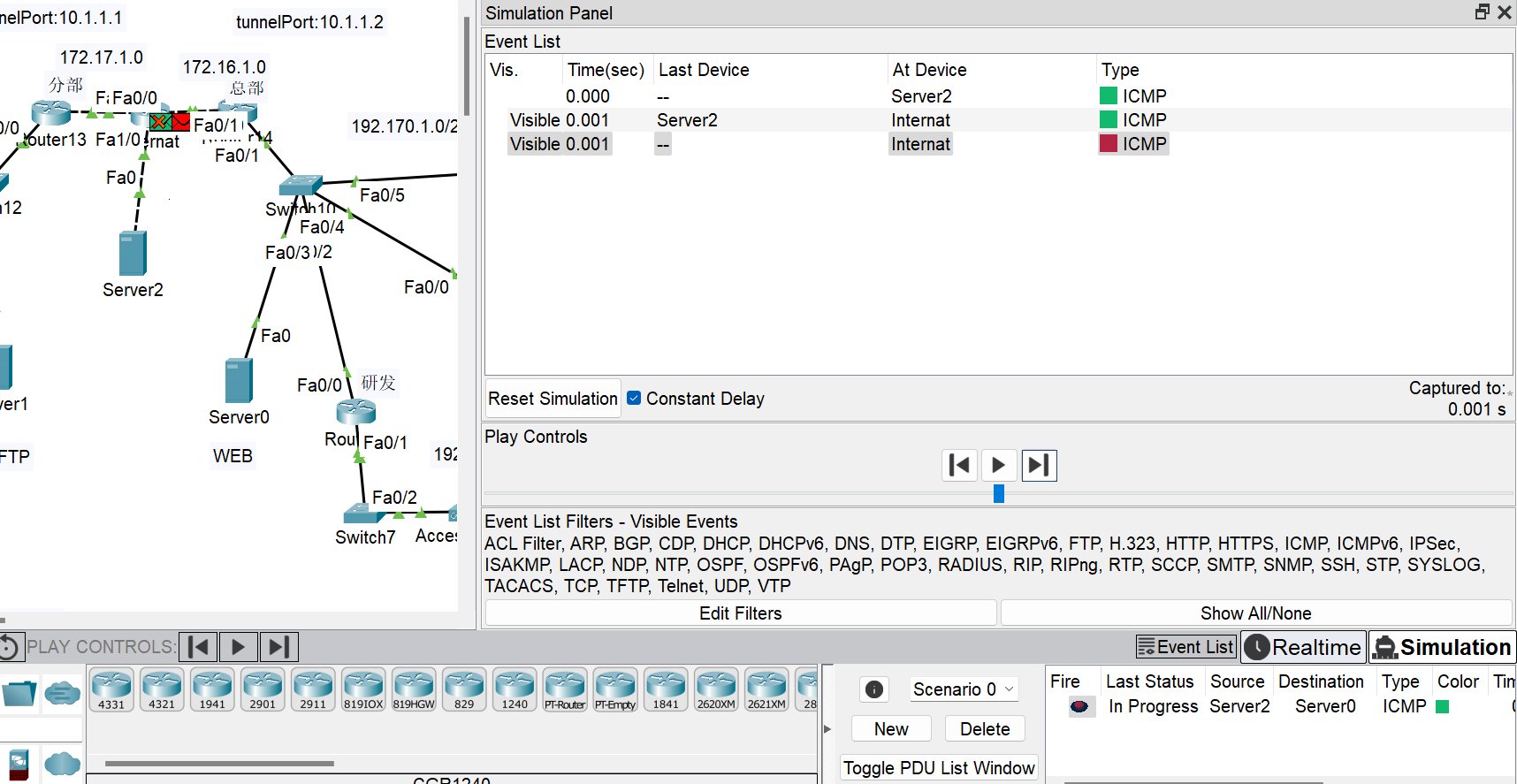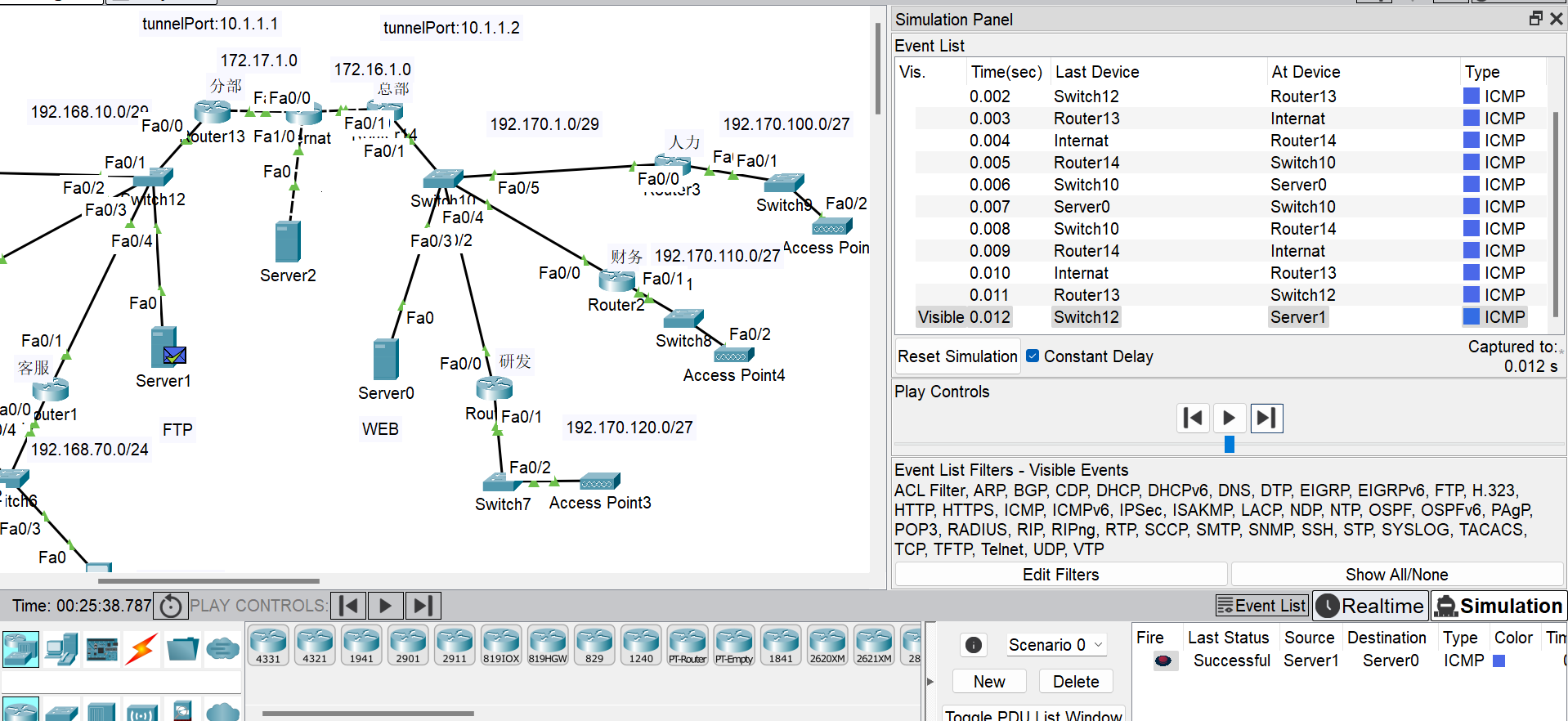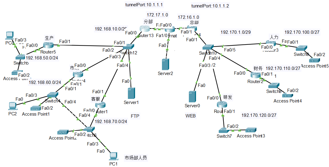 所有机器能上互联网;分部和总部网络资源共享;出差人员可以访问公司局域网的资源;部门处于不同网段;总部搭建 WEB 服务器,提供企业域名访问服务;分部搭建 FTP 服务器,提供文件服务;部门内部使用虚拟 IP 地址,部门之间和外部使用全球唯一地址,地址的分配使用 CIDR 方式;配置上网行为管理;配置无线 AP 和集中控制器;配置访问控制列表;总部配置静态路由分部的客服部有市场部人员(配置 VLAN);机器重启所有配置有效。备注:网络拓扑结构的设计统一使用 Cisco Packet Tracer 模拟器,下文中简称模拟器