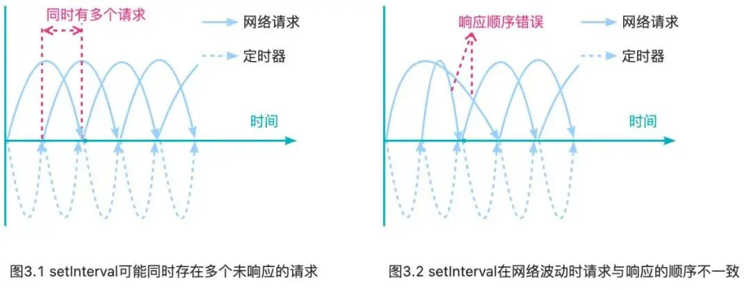 - 使用链式setTimeout()而不是setInterval,保证上一个请求结束后才能执行下一个请求