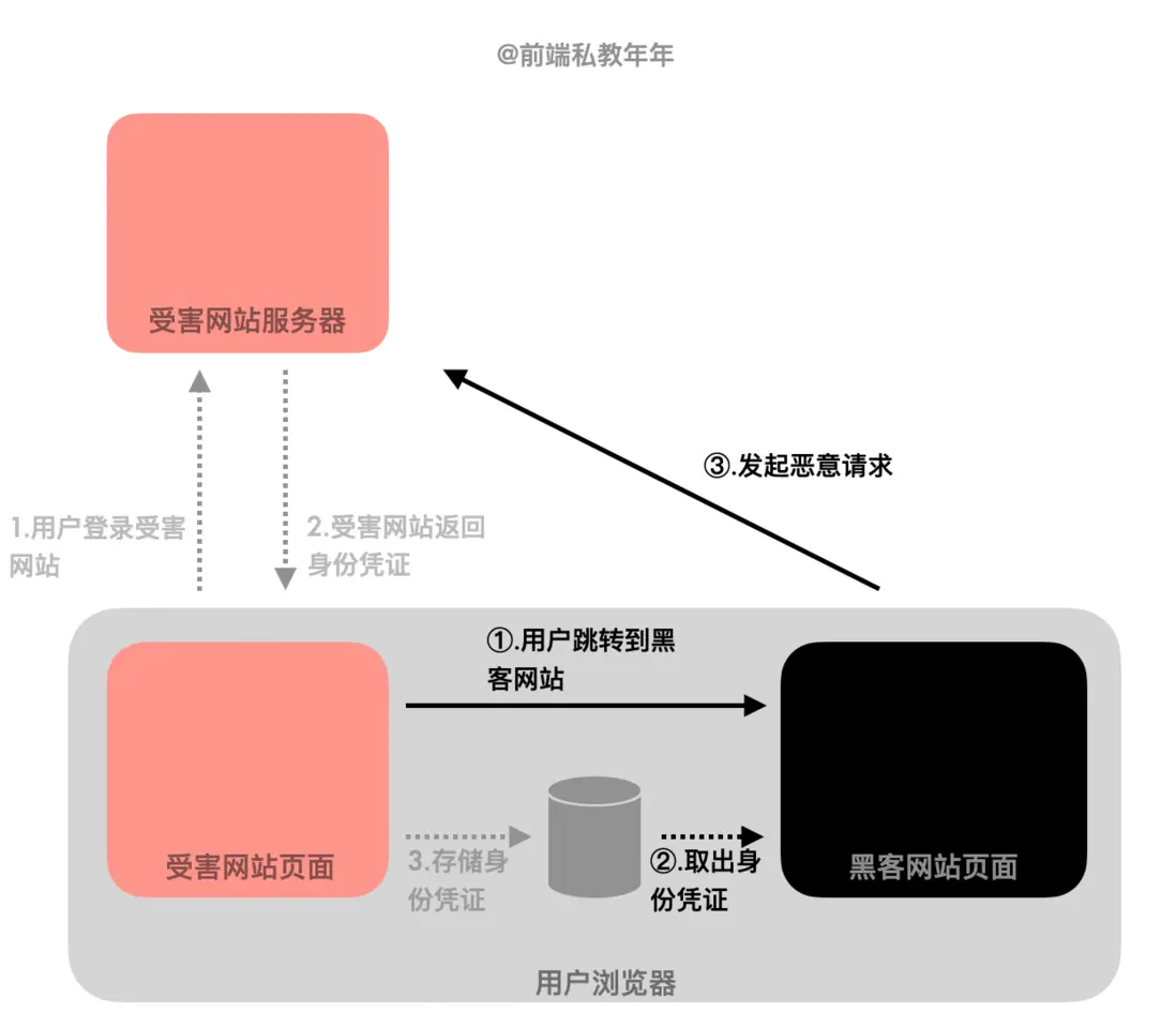 - 用户登录受害网站,浏览器把获取的身份凭证保存在本地cookie中;