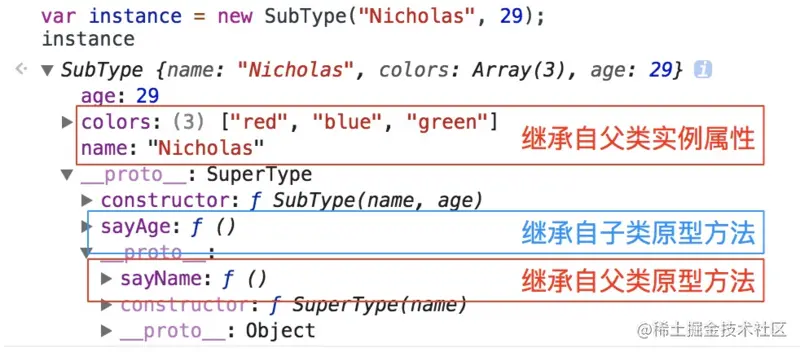 - 缺点:父类的属性同时存在于子类实例和子类原型对象中,造成冗余