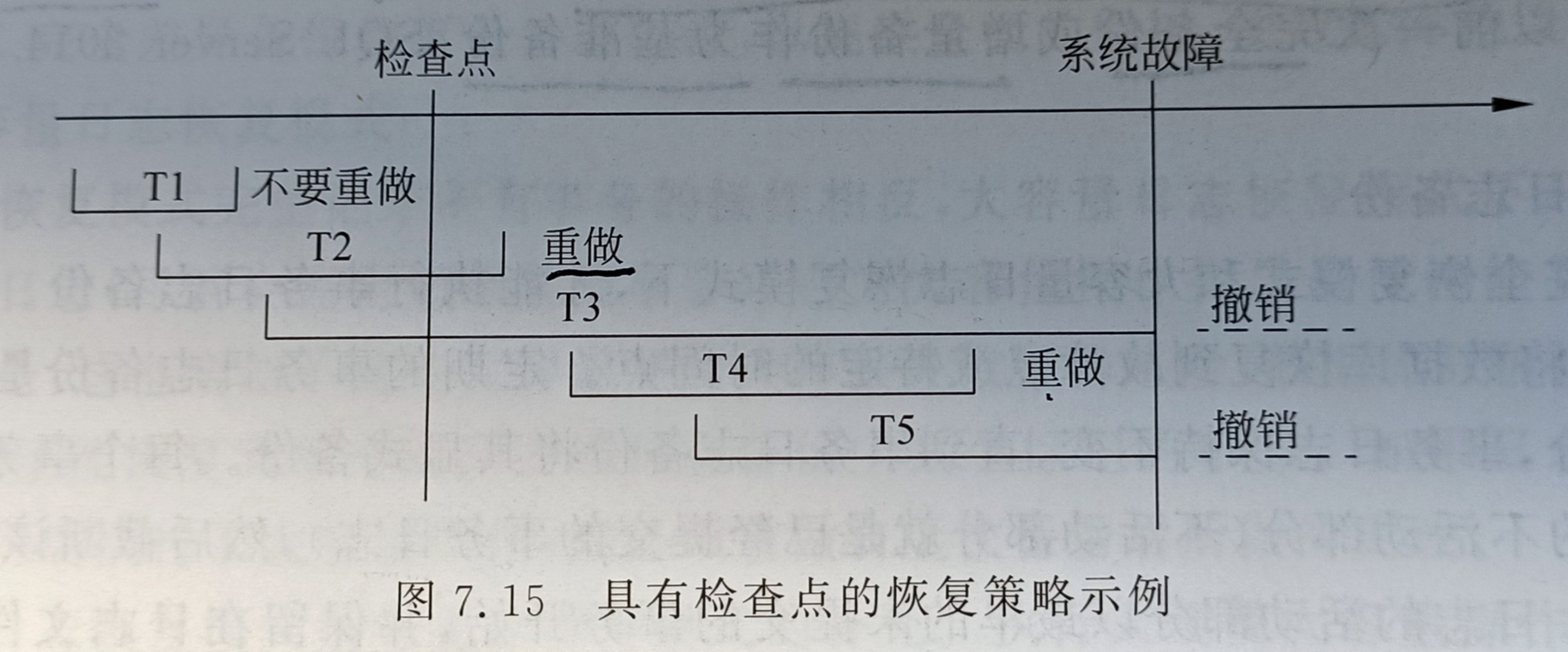 对于事务故障 即对于事务内部的错误,强制执行[use::回滚]操作 对于系统故障 对于突然的系统性的错误(如电源故障、CPU故障等),从上一个检查点开始,对检查点还未提交的数据执行[use::重做] 对故障点还未提交的事务执行回滚操作 实际