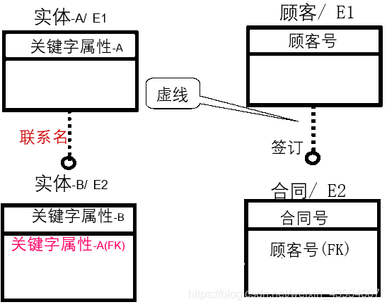 • 非标定联系用虚直线表示,在子实体一侧有圆圈,联系名标注在直线旁